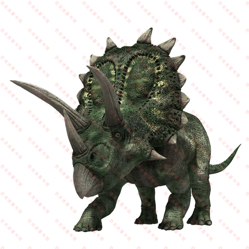 我叫五角龙,名字的含义是“长有五只角的脸”,其实我头上只有三只角,一只在鼻子上面,两只在眼睛上面。古生物学家一开始看到的另外两只“角”,只是我面颊上拉长了的颧(quán)骨。我有一个超大的脑袋,长度甚至超过了两米。其实我的脑袋很大一部分是由后面宽大的颈盾组成的,颈盾既能保护我的脖子,上面丰富的色彩和花纹也能用于展示和炫耀。除了颈盾,我眼睛上方两只长而锐利的大角才是最好的防御武器,哪个肉食恐龙胆敢招惹我,我会毫不客气地在它身上戳几个大窟(kū)窿(long)。与大脑袋相比,我的身体并不算庞大,但是很结实。我们五角龙喜欢群居,这样可以互相照顾,遇到危险时也能一致对敌。