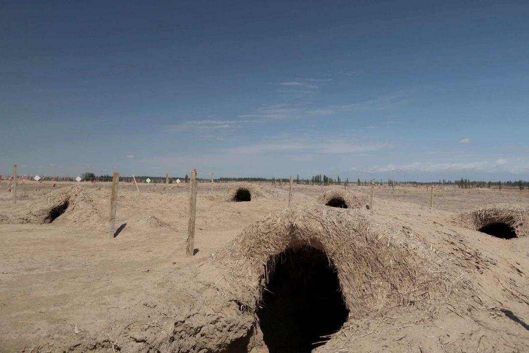 “地窝子”是20世纪50年代初,新疆建设兵团在戈壁沙漠垦荒时居住的地下“房屋”。当地气候干旱,水资源匮乏,冬冷夏热,风沙活动频繁,植被稀疏,极度荒凉且地处偏远,缺乏建筑材料。垦荒部队因地制宜,在地下挖1 —2米深的坑,顶部用土坯垒起约半米的“房顶”,土坯上面盖上红柳枝,地面铺上芦苇和杂草,作为生活休憩之所。“地窝子”进出口较小,且多朝南,这样可抵御冬春季节的风沙;“地窝子”冬暖夏凉,适应了当地夏热冬冷的气候特点。
