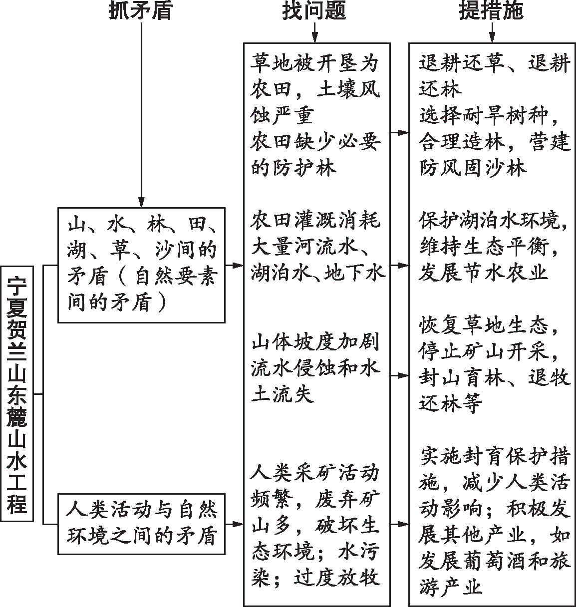 2.结合材料,以西北地区宁夏贺兰山东麓石嘴山段“山水工程”为例,分析“山水工程”具体的治理措施有哪些?